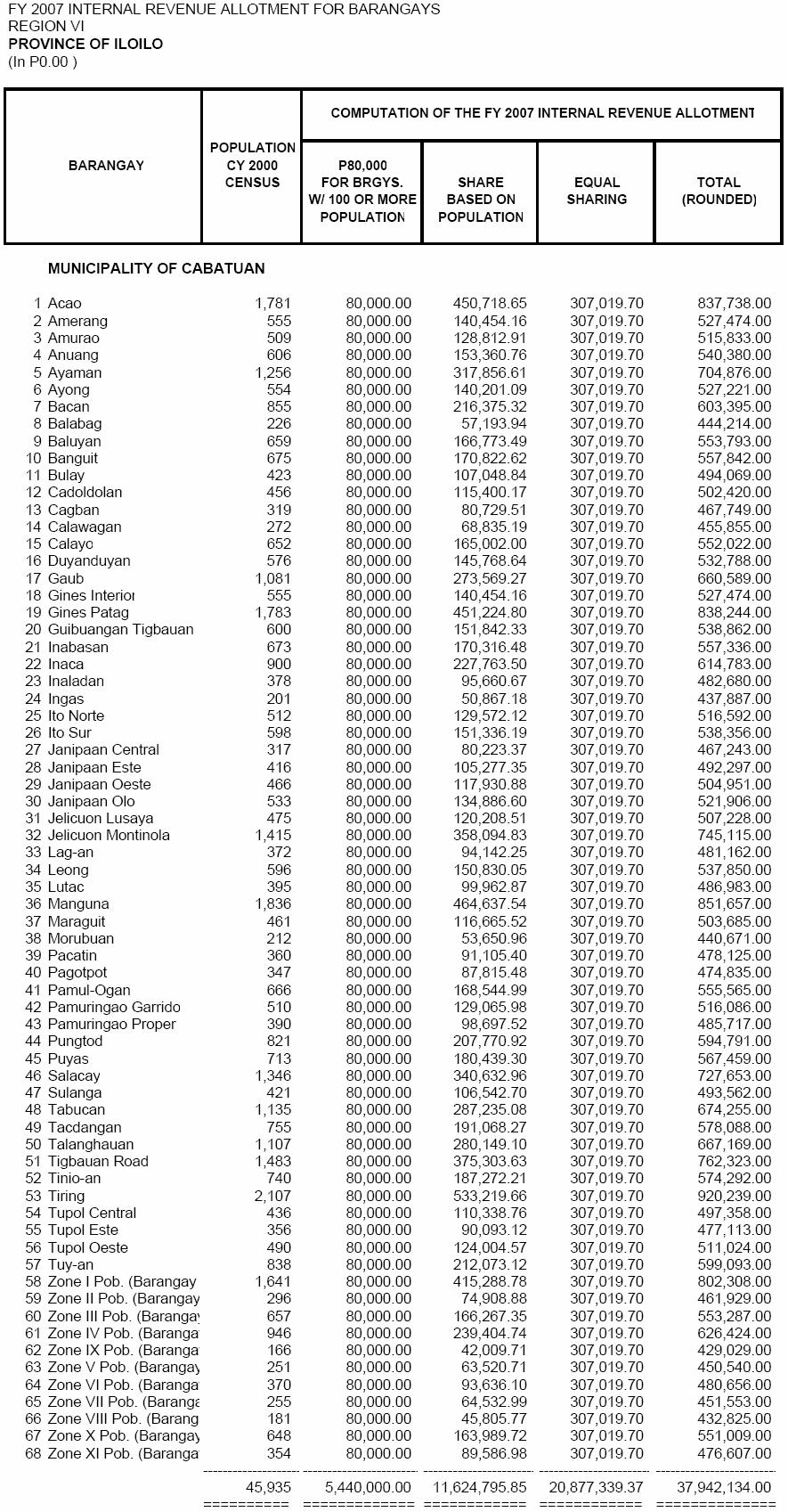 CABATUAN BARANGAY INTERNAL REVENUE ALLOTMENTS, CY 2007