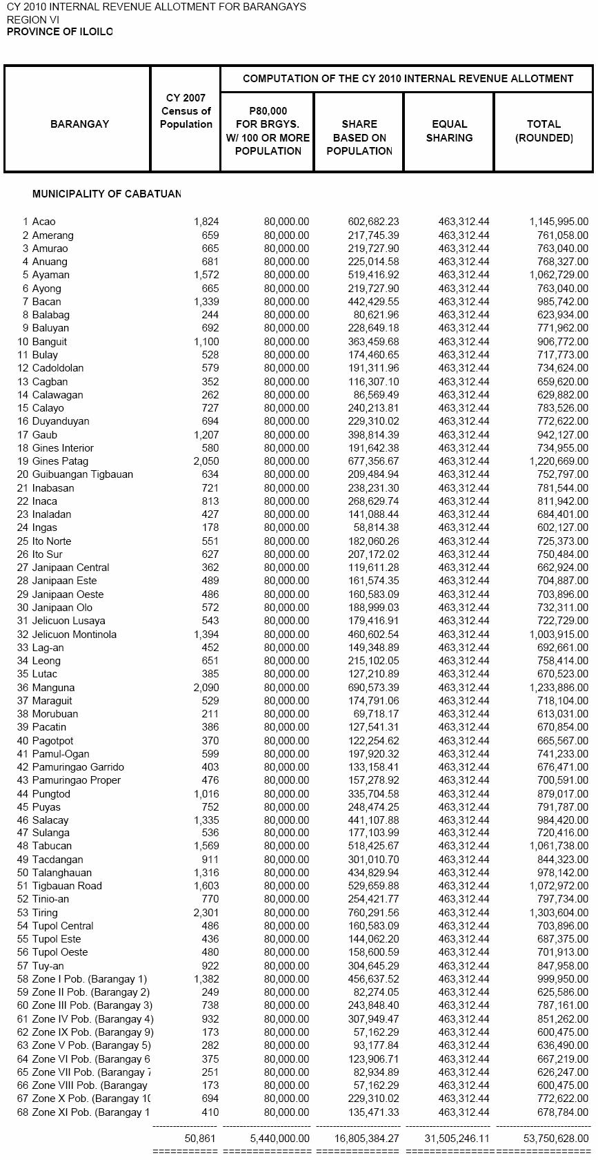 CABATUAN BARANGAY INTERNAL REVENUE ALLOTMENTS, CY 2010